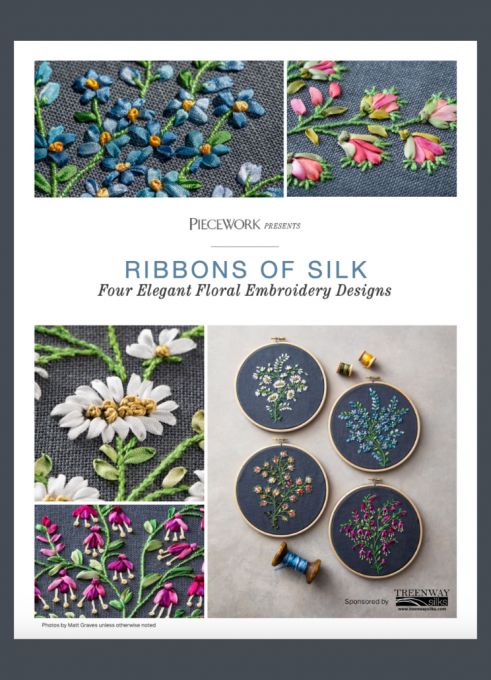 PieceWork magazine's Winter 2023, Spring 2024, Summer 2024 & Fall 2024 floral designs by Deanna Hall West are now in one convenient Ebook "Ribbons of Silk"